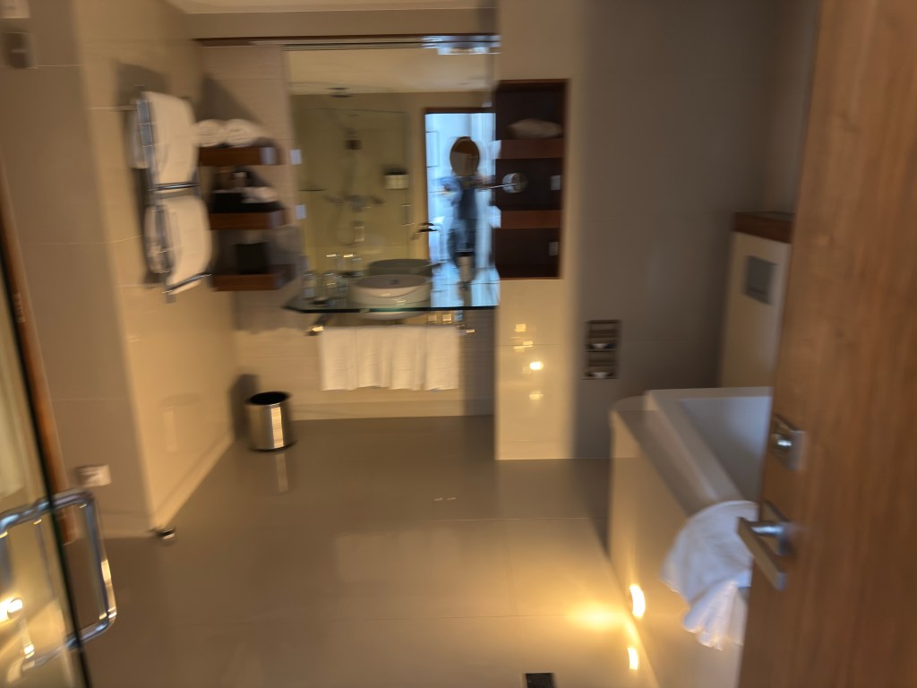 Our suite was more like a full suite than a junior suite with a separate living room and huge bathroom. A note and welcome gift of chocolates and macarons were left on the dining table. The hotel seemed very new or recently renovated as everything was in great shape.