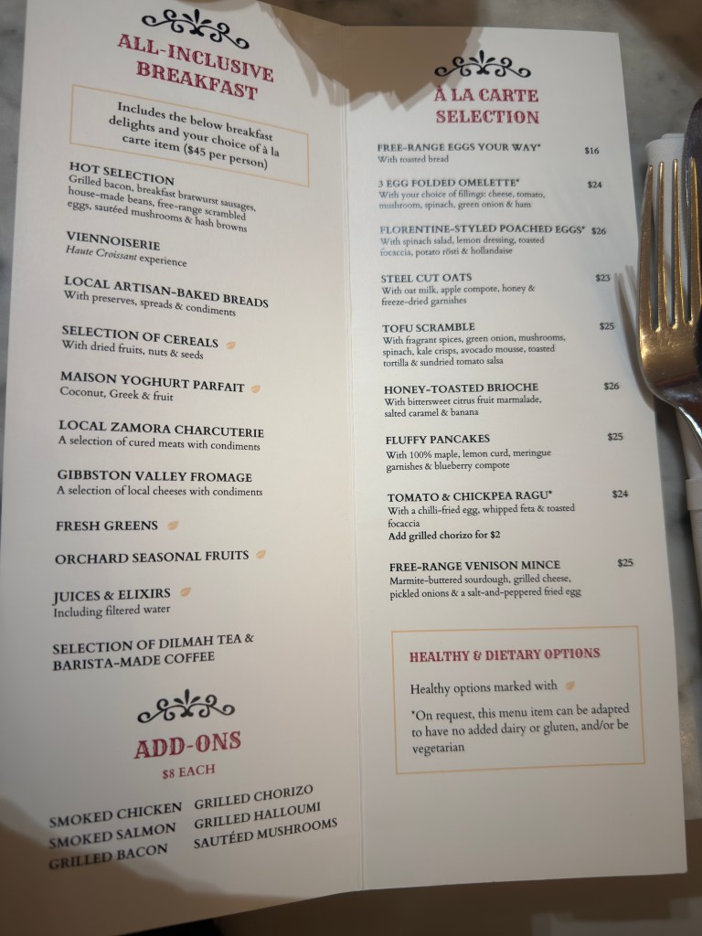 The next morning, we had a fantastic breakfast at the Left Bank Bistro. There was a buffet with a full cooked breakfast and other options as well as an a la carte selection from which we could order per our breakfast benefit.