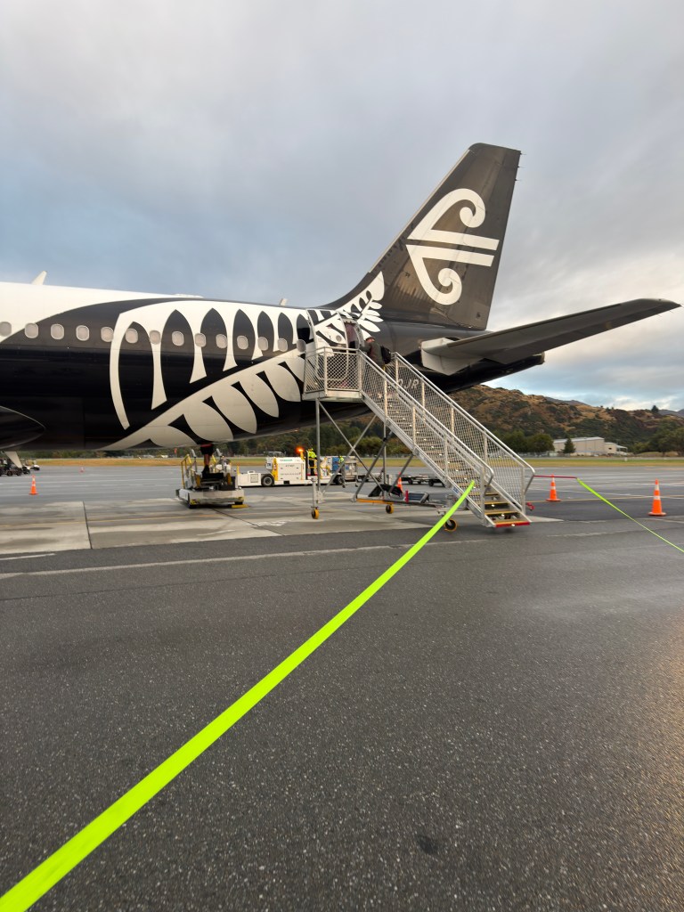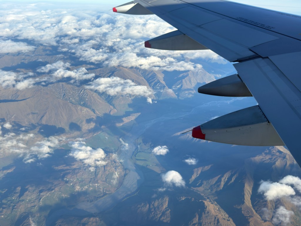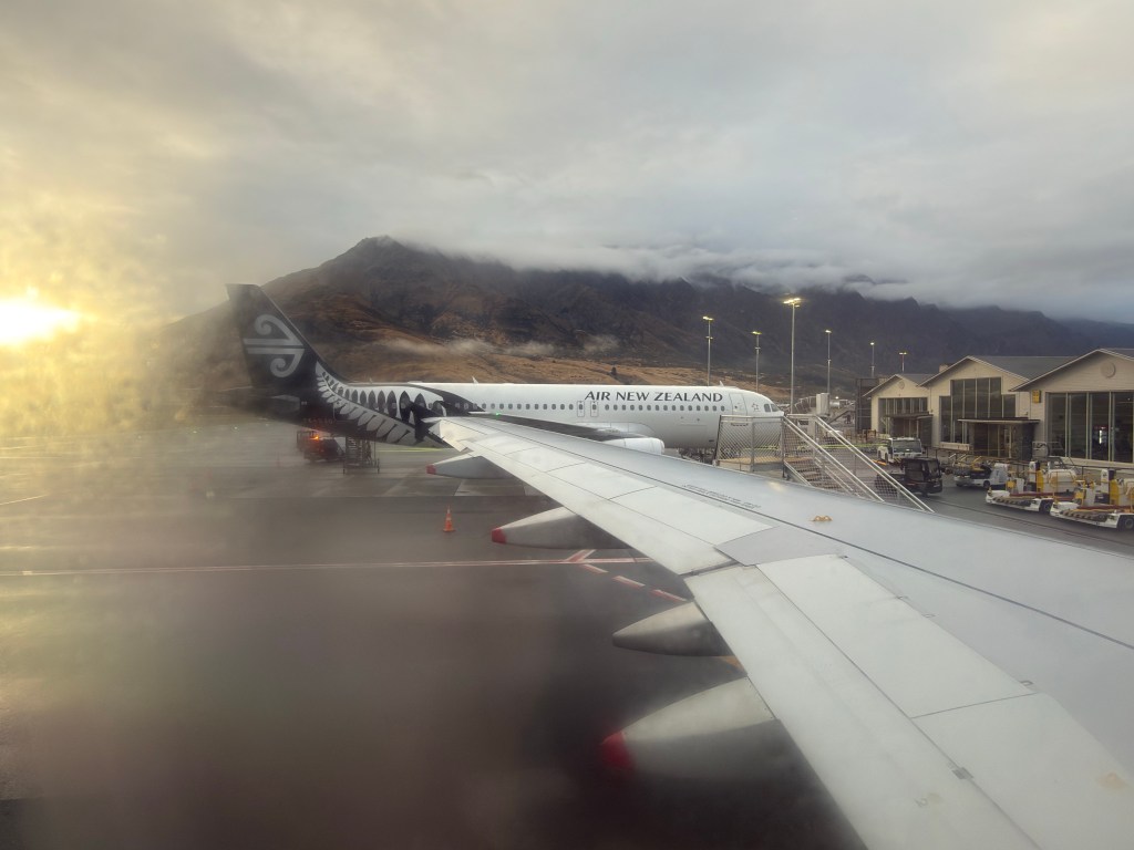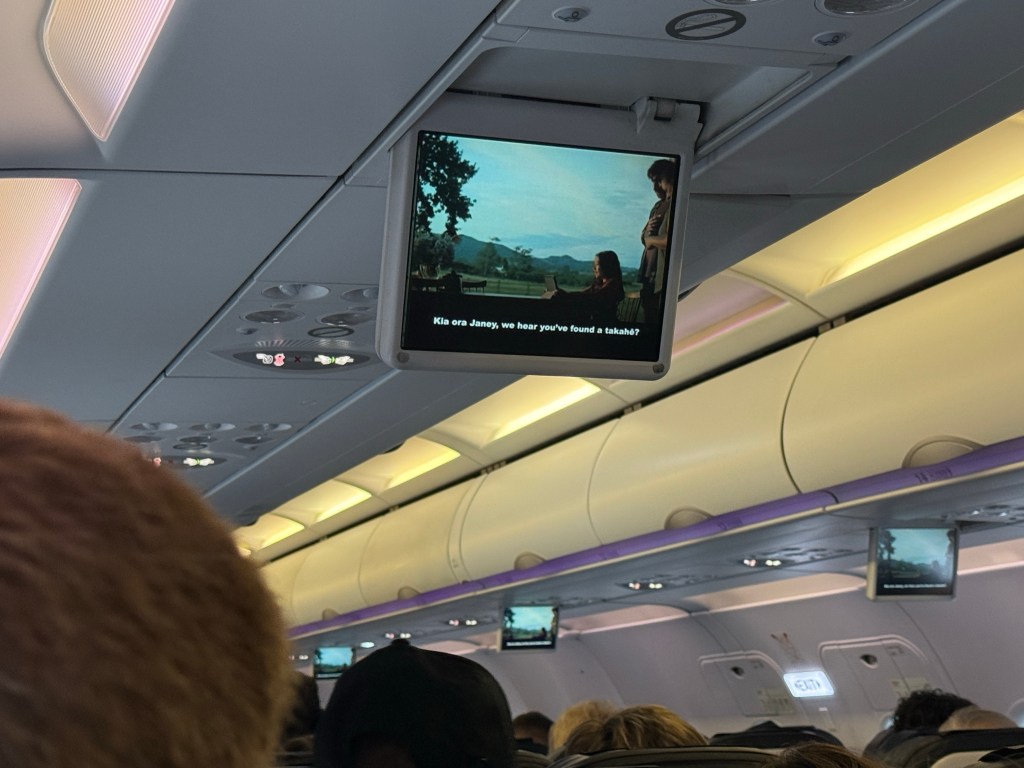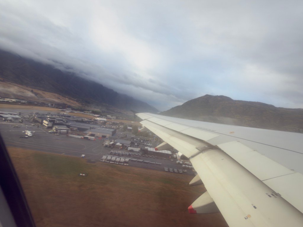 Legroom was a bit better than Jetstar but not much different. We pushed back on time and headed out of Queenstown by back taxiing up the runway and taking off to the south. The safety video was played on drop down screens as we taxied out.